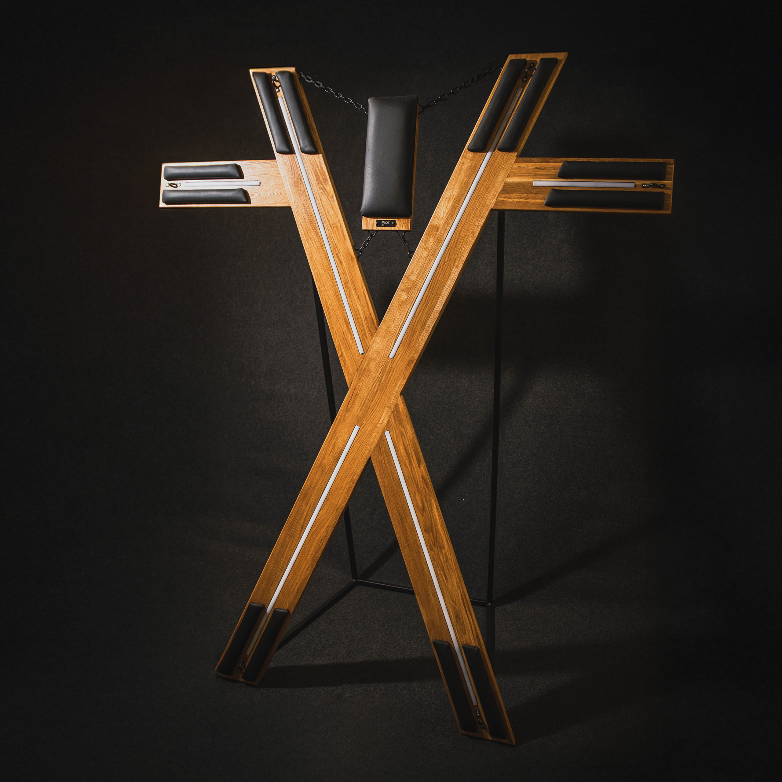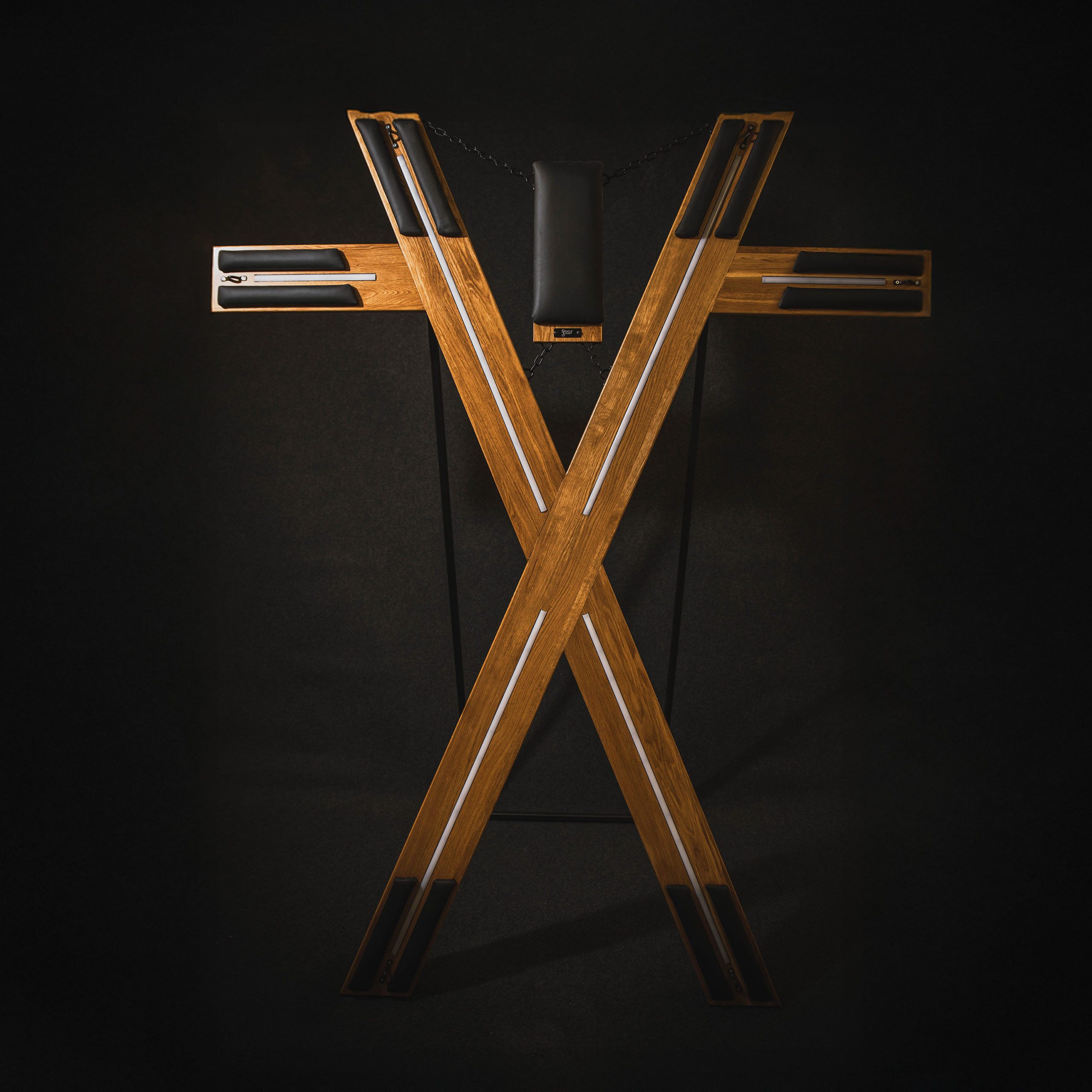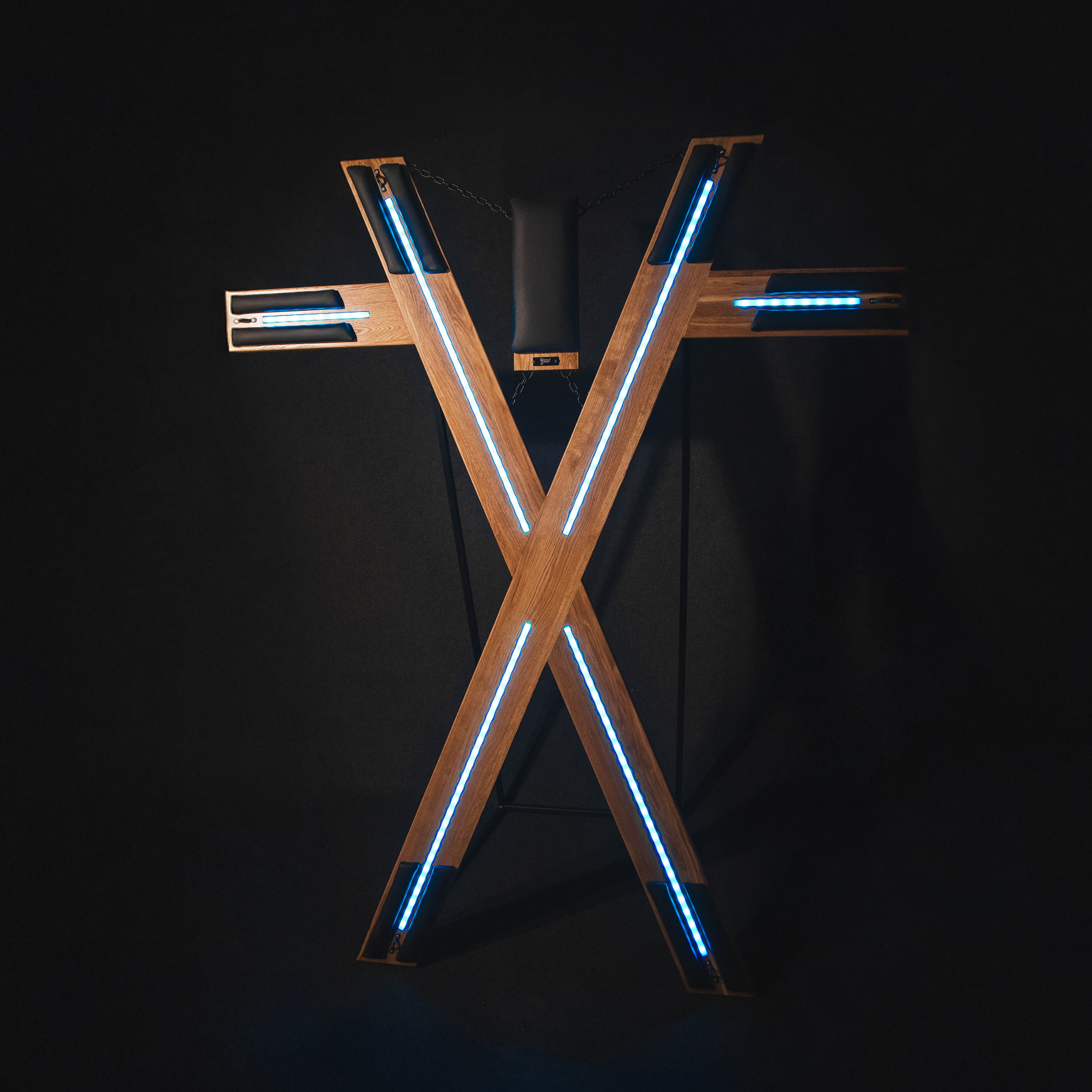 Symbole incontournable, cette croix de Saint-André est ici sublimée par un design à la fois puissant et raffiné. Entièrement réalisée en chêne massif, elle est équipée de coussins en cuir pour un confort optimal et d’une bande LED intégrée au centre, offrant un éclairage saisissant qui magnifie vos instants de jeu.